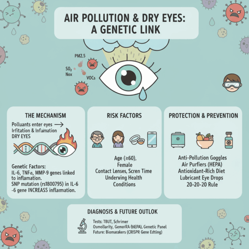 งานวิจัยด้านจีโนมิกส์เมื่อเร็ว ๆ นี้ได้ระบุยีนหลายตัวที่เกี่ยวข้องกับการตอบสนองต่อมลพิษอากาศและการควบคุมความสมดุลของน้ำตา ยีน IL‑6, TNF‑α, MMP‑9 และ SOD2 เป็นยีนที่ทำหน้าที่ควบคุมการอักเสบและการป้องกันอนุมูลอิสระในเยื่อบุตา เมื่อตัวอย่าง DNA ของผู้ป่วยตาแห้งที่อาศัยในพื้นที่มลพิษสูงถูกวิเคราะห์ พบว่ามีการแสดงออกของยีนเหล่านี้สูงกว่ากลุ่มควบคุมถึง 1.5‑2 เท่า