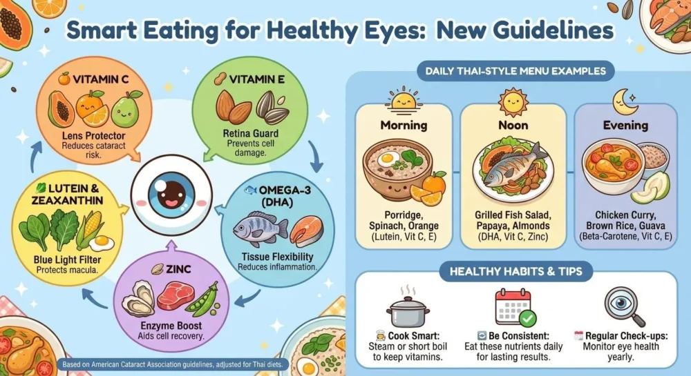 การดูแลสุขภาพตาไม่ใช่เรื่องยาก หากเรารู้จักเลือกกินอาหารที่อุดมไปด้วยสารอาหารที่สนับสนุนการทำงานของตาอย่างเหมาะสม สมาคมต้อหินแห่งอเมริกา (American Cataract Association) เพิ่งอัปเดตแนวทางโภชนาการใหม่ล่าสุด ซึ่งมุ่งเน้น 5 กลุ่มสารอาหารหลักที่ช่วยชะลอการเกิดต้อหินและจอประสาทตาเสื่อม (AMD) บทความนี้จะสรุปสารอาหารสำคัญ พร้อมแนะนำเมนูและปริมาณที่เหมาะกับวิถีชีวิตของคนไทย เพื่อให้คุณสามารถนำไปใช้ได้ทันที