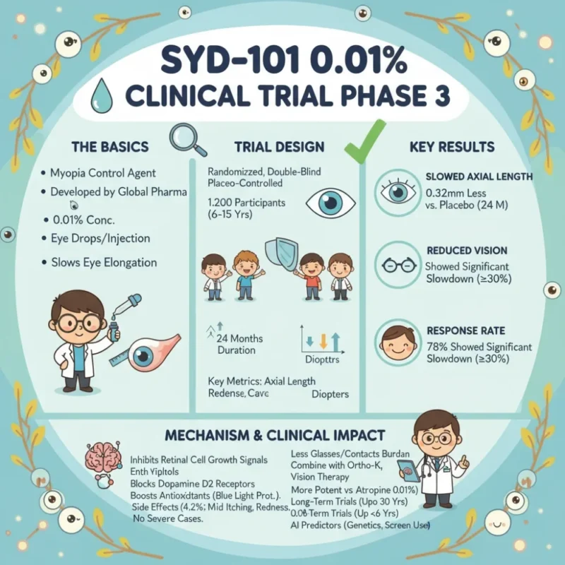 SYD‑101 เป็นสารต้านการเจริญเติบโตของตา (myopia control agent) ที่พัฒนาโดยบริษัทเภสัชกรรมระดับโลก ด้วยความเข้มข้น 0.01% สารนี้ถูกออกแบบให้ฉีดหรือใช้เป็นหยดตาเพื่อชะลอการยืดของแกนตา (axial length) ซึ่งเป็นสาเหตุหลักของการเพิ่มขึ้นของไมโอเปีย การทดลองขั้นที่ 3 นี้เป็นการทดสอบประสิทธิภาพและความปลอดภัยในกลุ่มผู้ป่วยอายุ 6‑15 ปี ที่มีไมโอเปียระดับกลางถึงรุนแรง