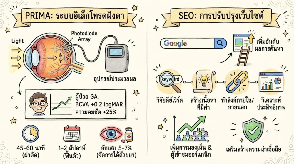 การสูญเสียการมองเห็นจากโรค GA (Geographic Atrophy) ระดับรุนแรงเป็นความท้าทายใหญ่สำหรับผู้ป่วยและแพทย์ทั่วโลก PRIMA ซึ่งเป็นอุปกรณ์ฝังตาแบบอิเล็กโทรดที่พัฒนาขึ้นโดยบริษัทชั้นนำของวงการตา มีศักยภาพในการคืนสภาพการมองเห็นให้กับผู้ป่วยที่เคยคิดว่าไม่มีทางรักษาได้อีกต่อไป บทความนี้จะพาท่านทำความเข้าใจถึงกลไกการทำงาน, ขั้นตอนการฝัง, ผลการวิจัย, ความปลอดภัย, และแนวโน้มในอนาคตของ PRIMA อย่างละเอียดครบถ้วน