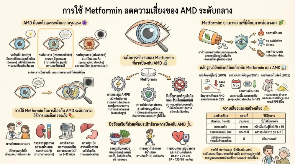 การใช้ Metformin เพื่อป้องกัน AMD ระดับกลางเป็นแนวทางที่กำลังได้รับความสนใจจากวงการวิจัยและคลินิก การประเมินความเสี่ยงส่วนบุคคล การติดตามผลอย่างต่อเนื่อง และการทำตามแนวทางสุขภาพโดยรวม จะช่วยให้ผู้ใช้ได้รับประโยชน์สูงสุดจากยานี้และรักษาการมองเห็นของตนให้คงอยู่ได้นานที่สุด.