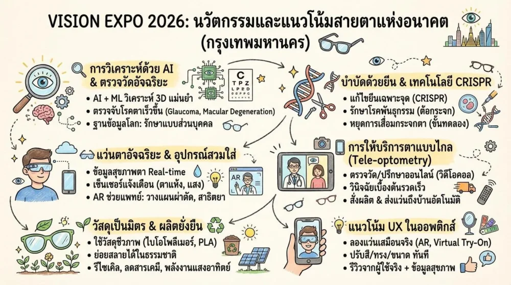 การจัดงาน Vision Expo 2026 ที่จัดขึ้นในกรุงเทพมหานครเป็นเวทีสำคัญที่รวบรวมผู้เชี่ยวชาญด้านออพติกส์ ผู้ผลิตอุปกรณ์สายตา และสตาร์ทอัพเทคโนโลยีจากทั่วโลก มุ่งเน้นการเปิดเผยนวัตกรรมล่าสุดและแนวโน้มที่กำลังเปลี่ยนแปลงวิธีการดูแลสายตาในยุคดิจิทัล ผู้เข้าร่วมงานได้สัมผัสกับเทคโนโลยีที่ผสานความแม่นยำของวิทยาศาสตร์กับการออกแบบที่เป็นมิตรต่อผู้ใช้ ทั้งในด้านการตรวจวัด การรักษา และการป้องกันโรคตา เราจะสรุปประเด็นสำคัญที่โดดเด่นจากงานนี้เพื่อให้คุณเข้าใจทิศทางของอุตสาหกรรมสายตาในปีต่อ ๆ ไป