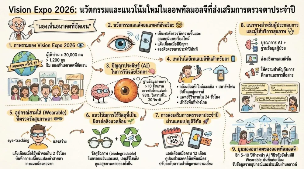 Vision Expo 2026 จัดขึ้นที่กรุงลอนดอนเป็นครั้งที่ 12 ภายใต้ธีม “มองเห็นอนาคตที่ชัดเจน” งานนี้ดึงดูดผู้เข้าร่วมกว่า 30,000 คนจาก 80 ประเทศ มีการจัดบูธแสดงผลิตภัณฑ์กว่า 1,200 รายการ ตั้งแต่เลนส์คอนแทคท์อัจฉริยะจนถึงระบบตรวจวัดความดันตาแบบไม่ต้องสัมผัส การประชุมเชิงปฏิบัติการ (workshop) และการเสวนา (panel) เน้นการถ่ายทอดความรู้และประสบการณ์จริงให้กับผู้ประกอบการและผู้เชี่ยวชาญ